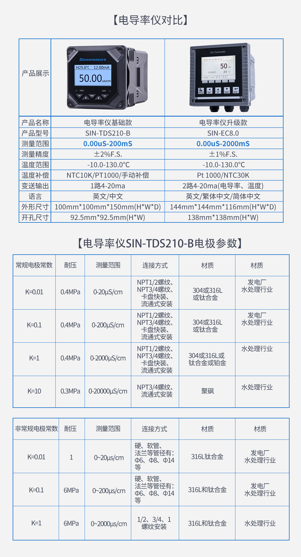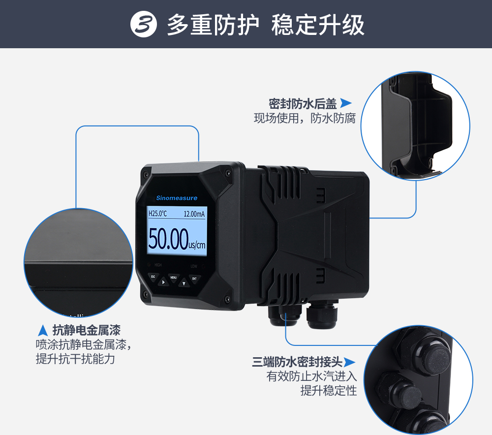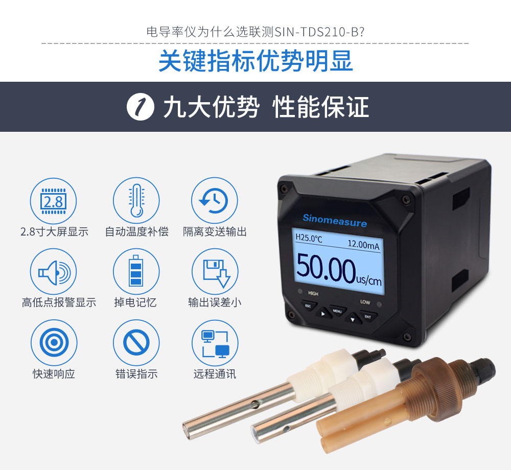 在線電導率儀是新一代全中文微機型儀表,具有全中文顯示、中文菜單式操作、全智能、多功能、測量性能高、環境適應性強等特點。二次表配上常數為1.0或10的電極可測量一般液體的電導率;配上0.1或0.01的電極,能準確測量純水的電導率,特別適用于電廠鍋爐給水和蒸汽冷凝水等高純水電導率的在線連續監測?! ÷摐y_SIN-TDS210-B在線電導率儀 EC儀 TDS 電鍍行業、污水、循環水等檢測_