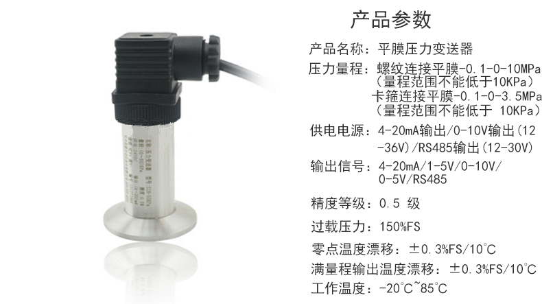 平膜結(jié)構(gòu)壓力變送器采用波紋膜直接感受壓力。傳 感器平膜片防止了污垢,不衛(wèi)生及粘稠液體堵塞等問題。 具有體積小、重量輕、長期穩(wěn)定性好等特點(diǎn),廣泛應(yīng)用 于食品、醫(yī)藥、衛(wèi)生及釀酒工業(yè)等行業(yè)。